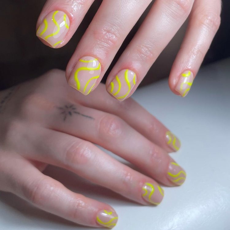 Щоб додати яскраву родзинку в образ, достатньо прикрасити короткі нігті з нюдовою основою яскравими жовтими завитками. Цей простий у виконанні дизайн неодмінно приверне увагу оточуючих.