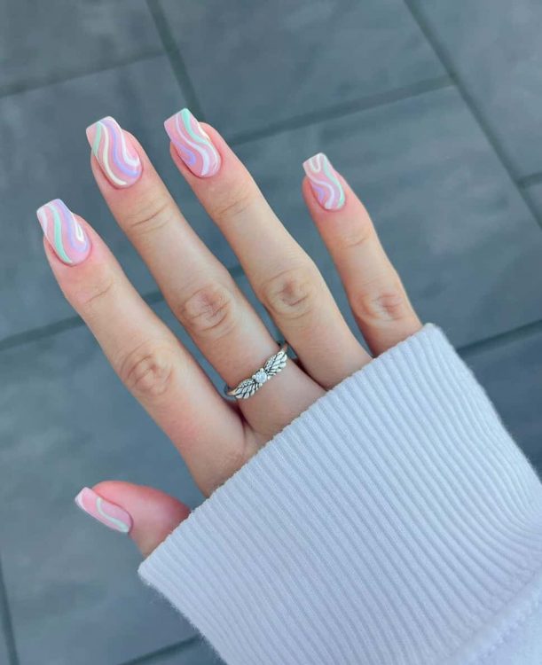 Цей чудовий дизайн нігтів з райдужними завитками ідеально підійде вам, якщо ви плануєте створити ретро-образ. Поєднання яскравих відтінків робить манікюр веселим та життєрадісним та надає йому вінтажного вигляду.