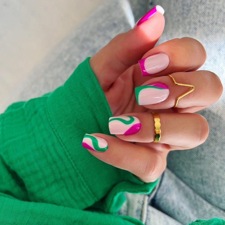 Рожевий і зелений – одне з найефектніших поєднань кольорів, і цей манікюр служить черговим доказом даного твердження. Він абсолютно точно приверне увагу оточуючих, куди б ви не пішли.