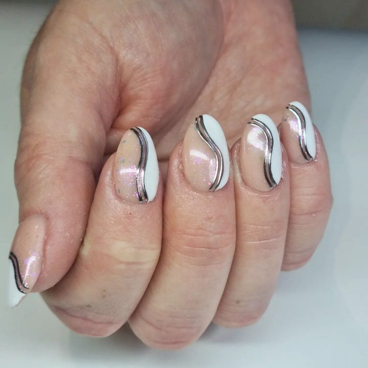 У цьому дизайні кожен ніготь ділить на дві половини хвиляста металева лінія. Одна половина забарвлена у нюдовий колір, а інша – у білий.