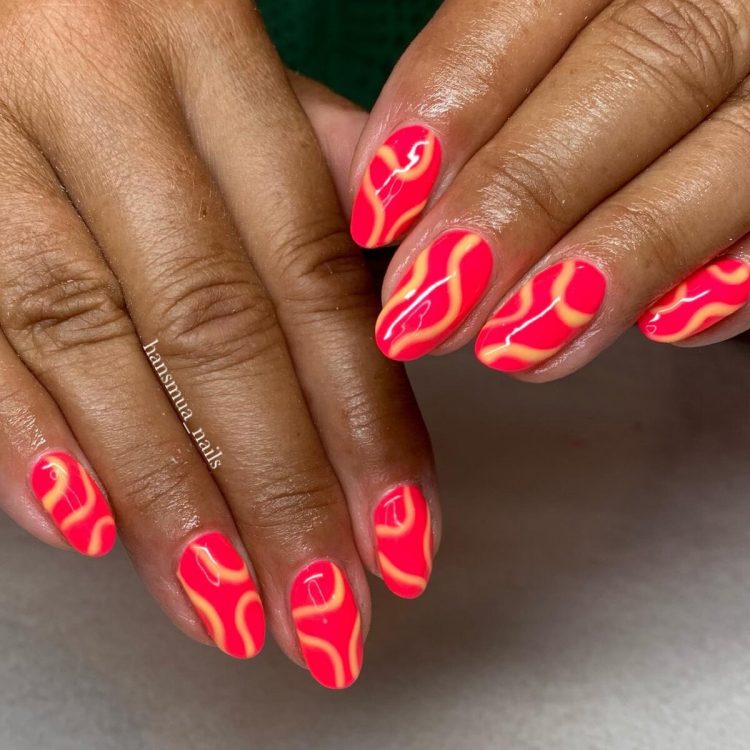 Не знаєте, як обіграти яскраво-рожевий лак для нігтів? Спробуйте нанести на нього хаотичні хвилясті лінії світло-жовтогарячого кольору. Цей дизайн випромінює позитивну енергію та освіжає образ.