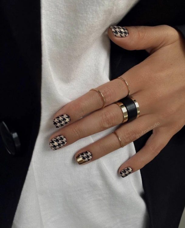 Ще один варіант нейл-арту, який вибирають стильні леді, – це манікюр з візерунком “гусяча лапка”, який вважається істинно королівським і шляхетним.
