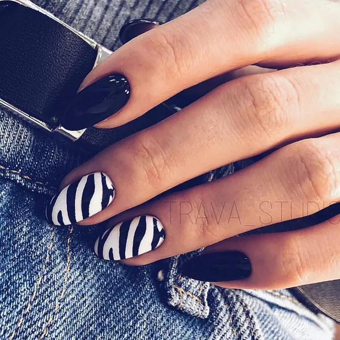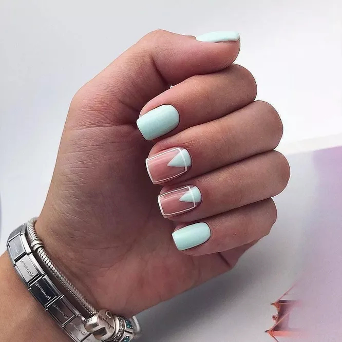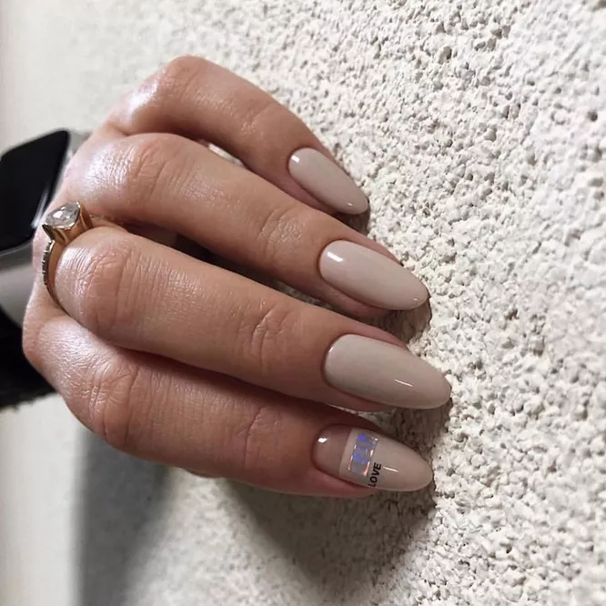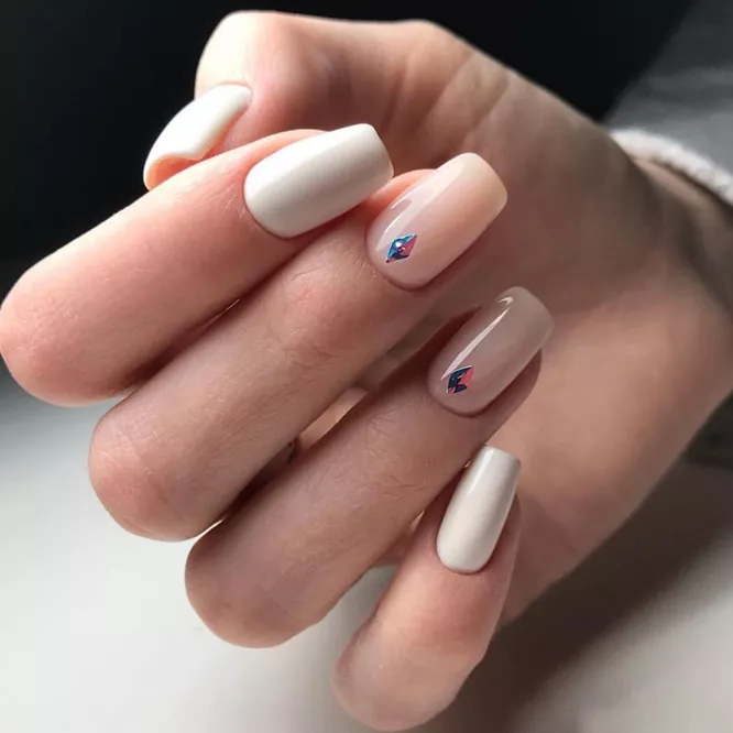 Якщо у вашій душі живе сорока і періодично вимагає додати блиску в ту чи іншу деталь образу, піддайтеся спокусі у манікюрному кабінеті. Зверніть увагу на мінімалістичні блискучі вставки, з ними манікюр на коротких нігтях овальної форми або манікюр на квадратних нігтях виглядатиме цікавіше. Не втрачають популярності й наклейки — строгої геометричної або, навпаки, вільної асиметричної форми.