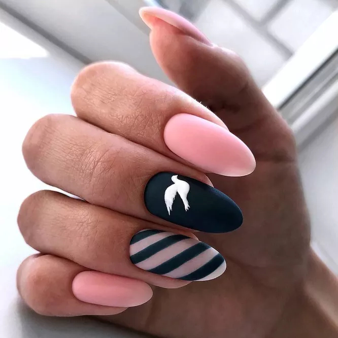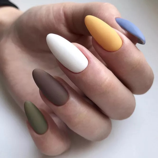 Гарний манікюр на довгі нігті – найчастіше вони мигдальної форми – необов’язково супроводжуватиметься хитромудрим дизайном. Зверніть увагу на колір! Нам подобаються відтінки перших весняних кольорів – жовтий, рожевий, ніжно-блакитний, білий. Сміливо пробуйте яскраві поєднання своїх улюблених відтінків!