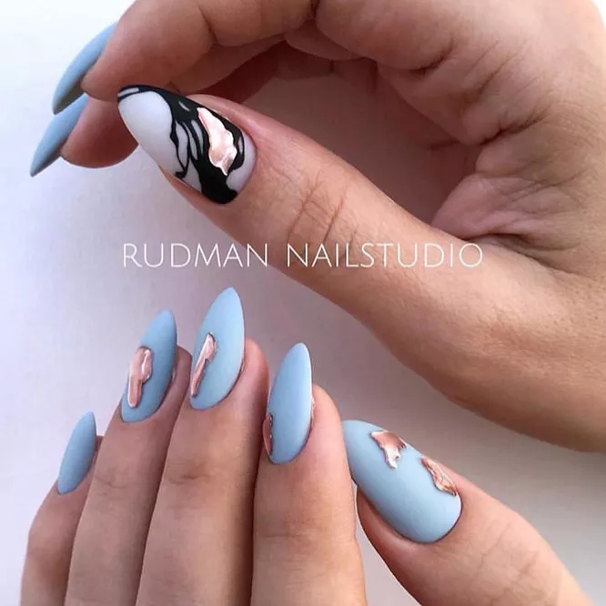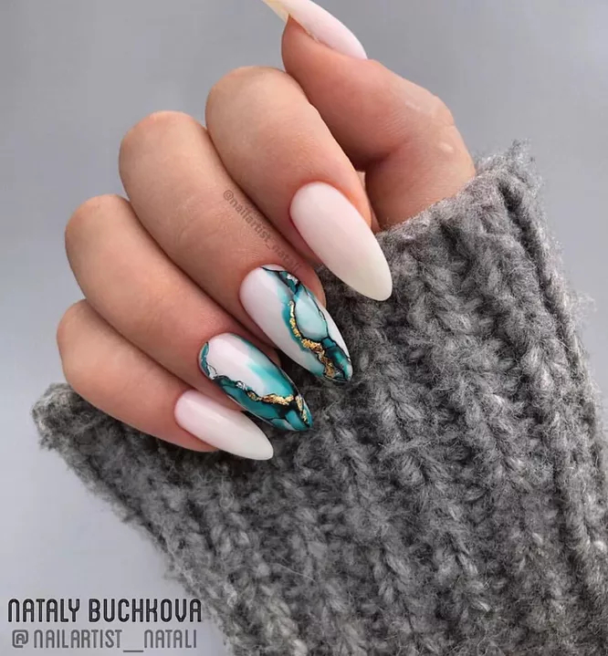 Коли сюжети для наклейок вичерпані, а геометричні візерунки відсилають вас до шкільних уроків, придивіться до мармуру чи ефекту кам’яного зрізу. Виглядає дуже благородно: манікюр на довгі нігті мигдальної форми із цим ефектом відразу змінюється.