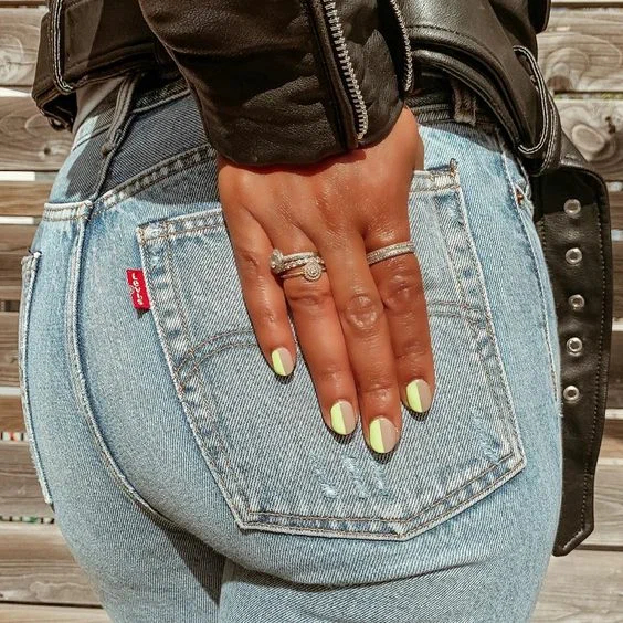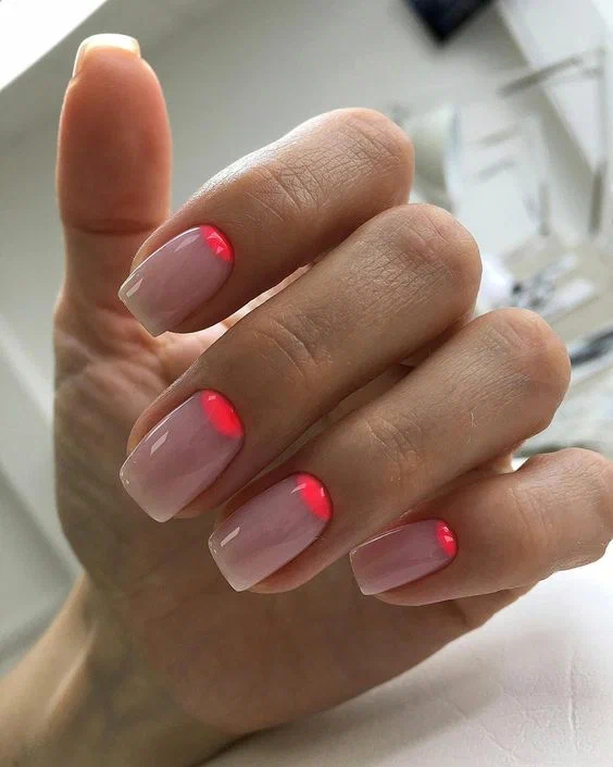 Френч навпаки або, як його ще називають, “лунки” – також можна сміливо віднести до актуальних трендів. Нюдове тло + неоновий лаконічний дизайн – це саме те, що потрібно навесні вашим ручкам.