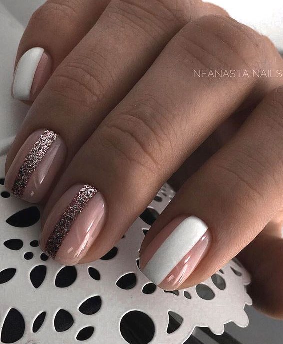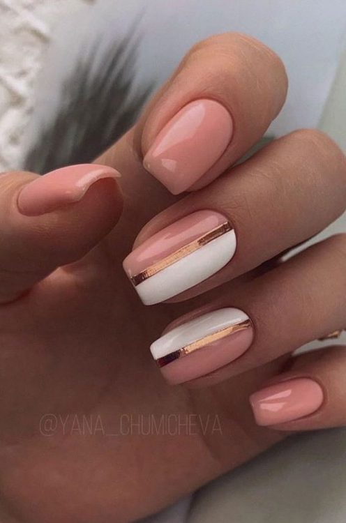 Поєднайте в одному манікюрі нюдову основу, білі деталі та розкішний золотий блиск. В результаті ви отримаєте неймовірно жіночний, вишуканий та елегантний дизайн нігтів, який чудово підійде для урочистого випадку.
