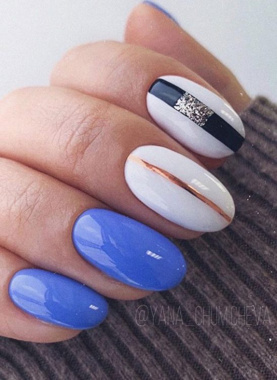 У цьому манікюрі половина нігтів забарвлена в яскраво-синій колір, а інша – в сліпучо-білий. Це дозволяє отримати гарний та ефектний контраст відтінків. Оригінальності дизайну додають блискучі акценти.