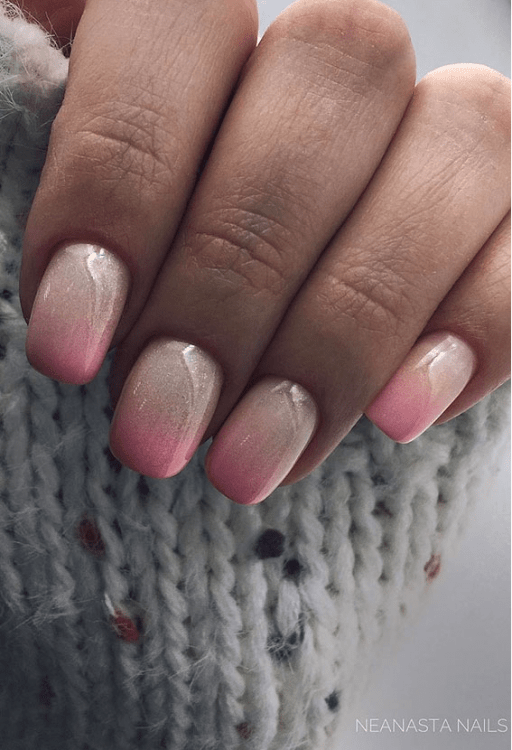 Ця ідея манікюру сподобається тим, хто любить дизайни у техніці омбре. Ніжно-рожеві кінчики нігтів ідеально поєднуються з бежевою основою, що переливається золотими блискітками. Це чудовий варіант для тих, хто хоче, щоб їхній манікюр був помічений.