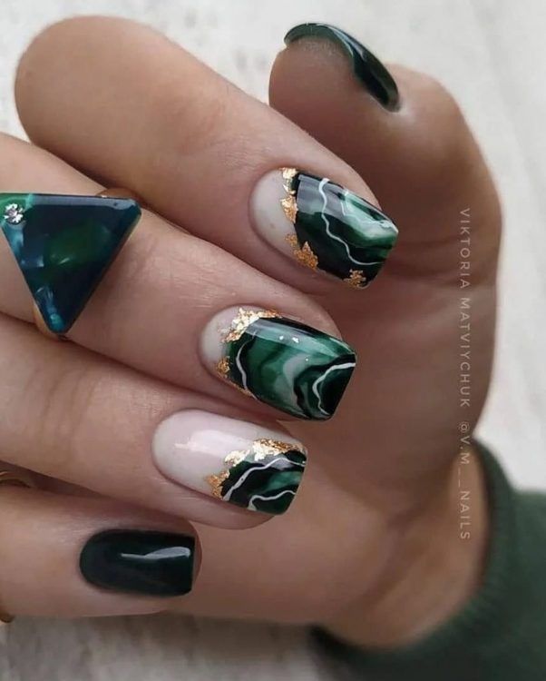 Якщо ви шукаєте ідею для елегантного дизайну нігтів під мармур, зверніть увагу на цей нейл-арт. У ньому біла основа красиво контрастує із смарагдовими мармуровими візерунками. Нотку розкоші додає манікюру золота фольга.