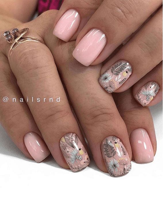 Настала весна, а отже, прийшов час створити відповідний настрій за допомогою квіткового дизайну. Він виглядає дуже мило, просто та елегантно. Прикрасьте ніжними малюнками кілька акцентних нігтів, а інші нафарбуйте однотонним нюдовим лаком, щоб отримати чарівний манікюр на кожен день.