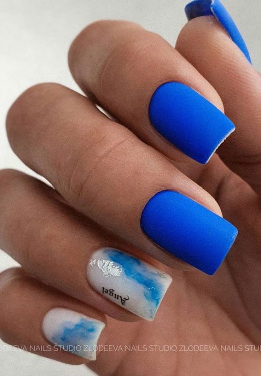Шукаєте яскравого дизайну нігтів? Тоді сміливо використовуйте контрастну комбінацію кобальтово-синього та білого кольорів. Щоб зробити дизайн ще стильнішим і сучаснішим, віддайте перевагу матовому фінішу.