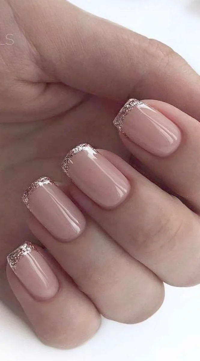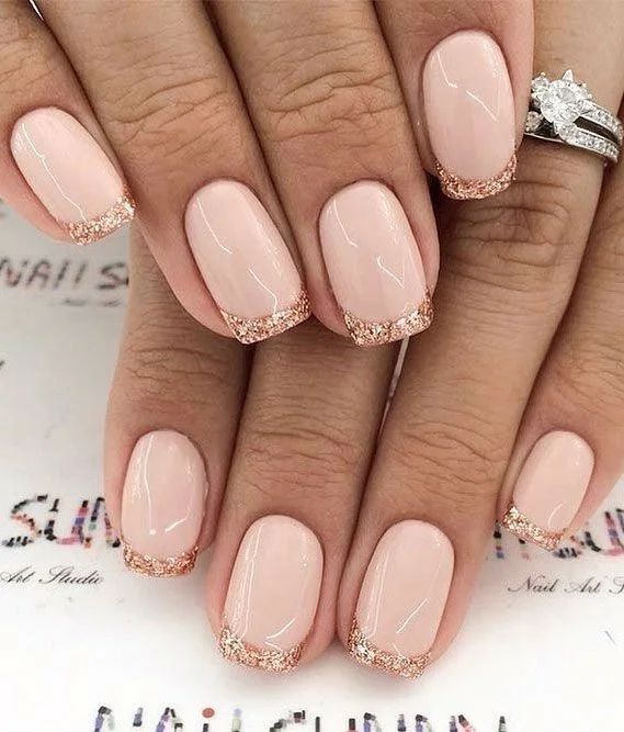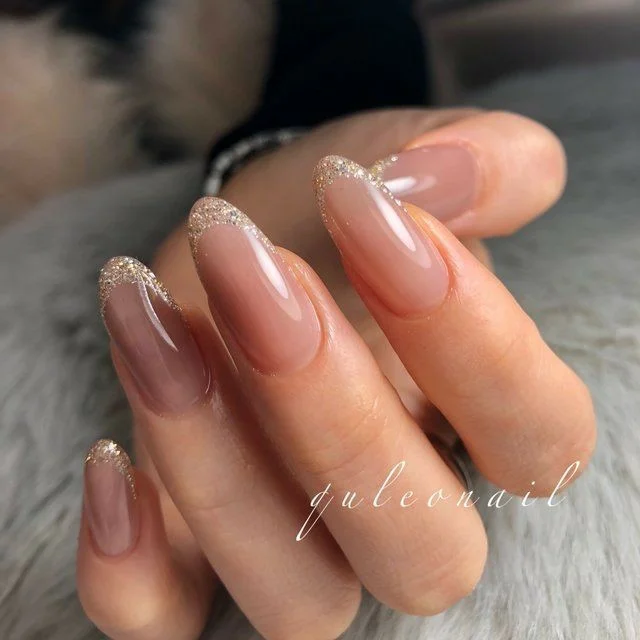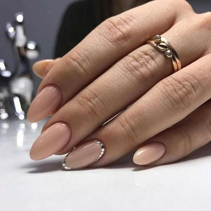 Нюдове покриття чудово поєднується з блискучим доповненням. Жінки вибирають різні блискітки. Найчастіше вибір зупиняється на класиці – золотистих і сріблястих варіантах.