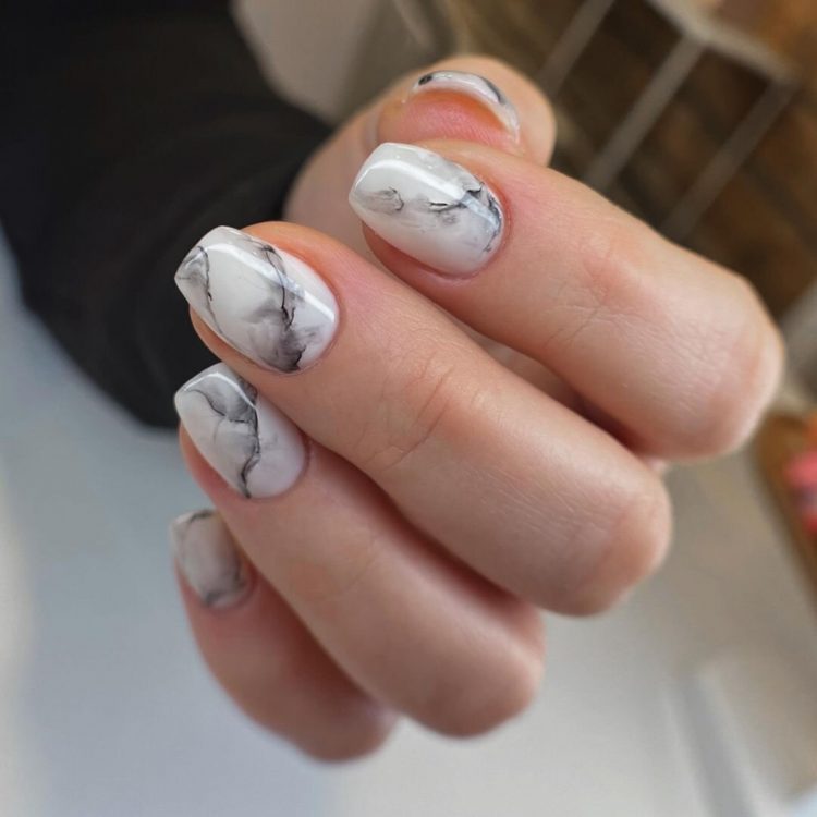 Традиційний варіант мармурового дизайну – це біле покриття з видимими розводами – чорними або темно-сірими. Стримана класика, яка ніколи не втратить своєї актуальності і добре виглядатиме з будь-якими луками.