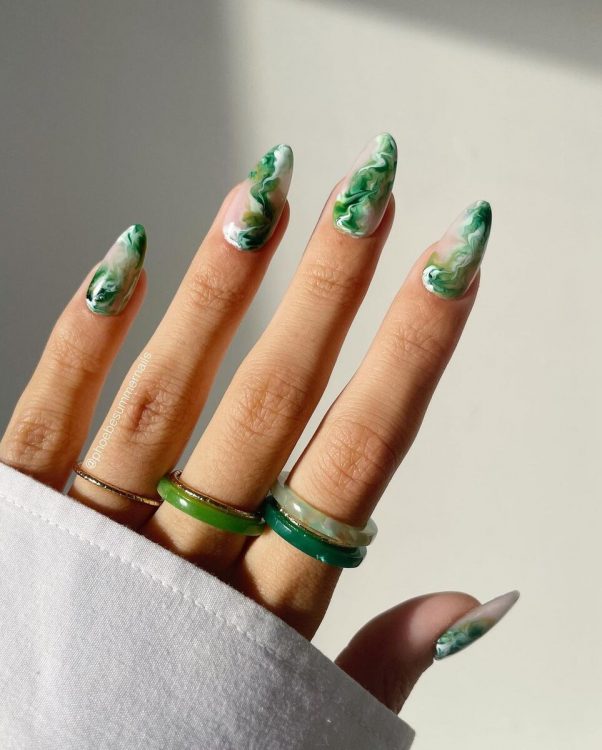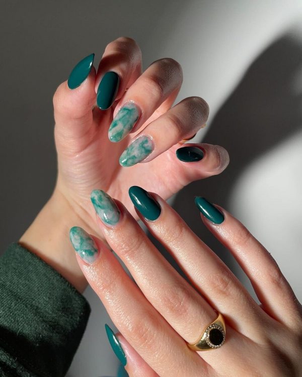 Яскравий, незвичайний, такий, що привертає увагу, – це все про зелений колір. Його відтінки (бірюзовий, смарагдовий, оливковий, салатовий) утворюють ефектні розводи на нігтях. Ще один ідеальний колір для теплого сезону.