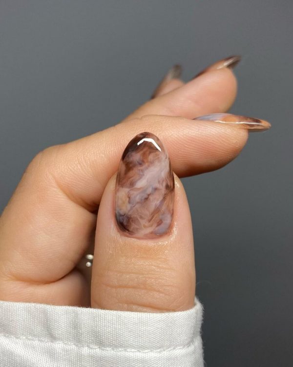 Нестандартний колір покриття, який не так часто вибирають дівчата, – це коричневий. То чому б не спробувати мармуровий дизайн у цьому відтінку? Бежеві, бордові та каштанові візерунки, що перетікають один в інший, створюючи димчастий ефект.