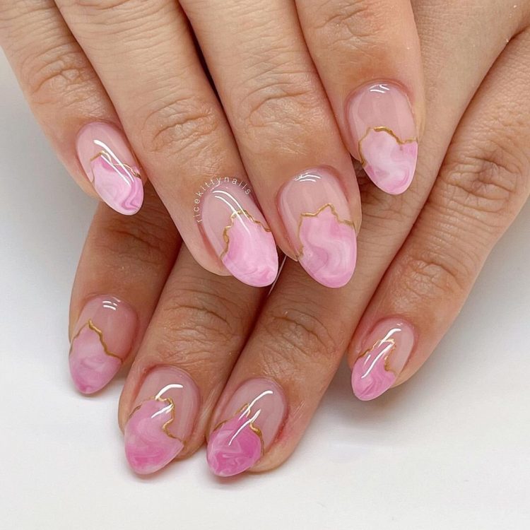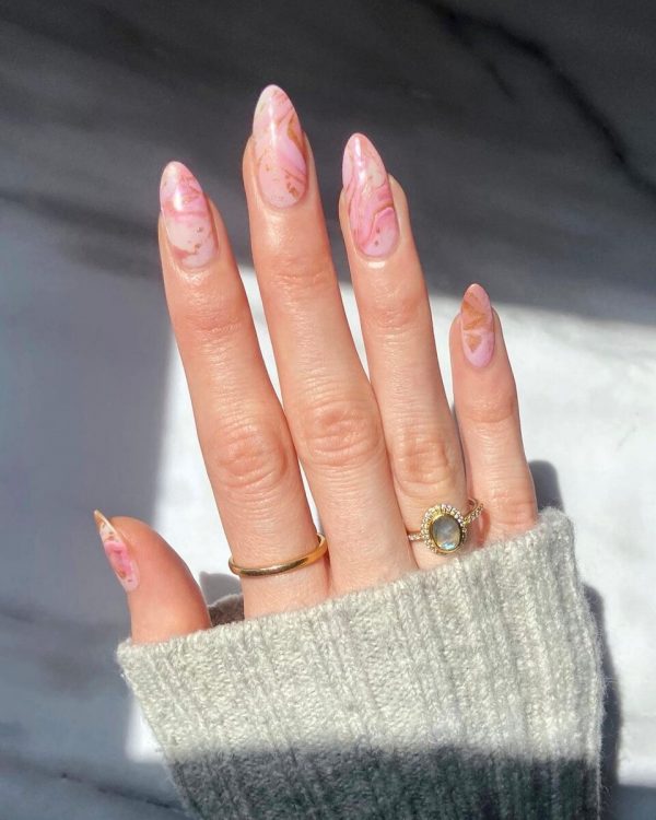 Якщо хочеться урізноманітнити звичний мармуровий манікюр, варто додати до нього декор. Наприклад, із «кам’яним» дизайном органічно поєднуються золоті елементи. Сяючі лінії, які повторюють текстуру мармуру, стануть незвичайним акцентом дизайну.