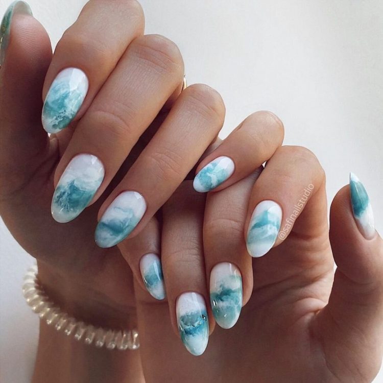 Синьо-зелені переливи нагадують рух морських хвиль. Тому, якщо відпустка десь на узбережжі ще лише у планах, намалюйте собі стихію на нігтях.