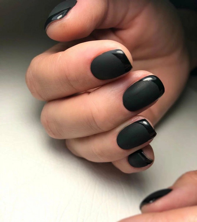 Незвичайний френч, виконаний у поєднанні глянсового та матового покриття, виглядає стильно, ефектно та оригінально. Наприклад, кінчик нігтя блищить, а головне покриття матове.