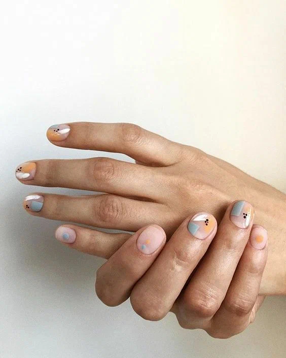 Беремо за основу нюд, малюємо на ньому хаотично абстрактні елементи, доповнюємо їх геометричними фігурами. Після закінчення використовуємо матовий фініш.