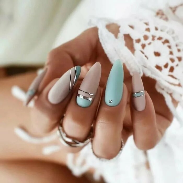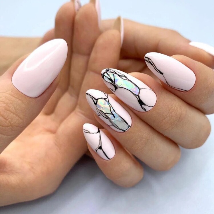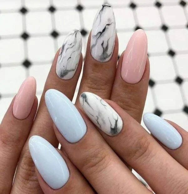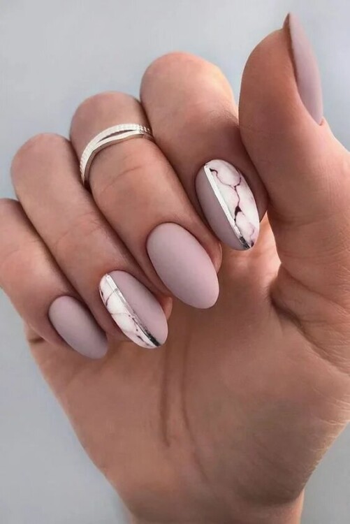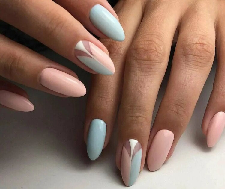 Особливою популярністю зараз користується пастельний манікюр з контрастними декоративними елементами, наприклад, квітами, імітацією мармуру, мереживом або геометрією. Вони можуть бути присутніми на кількох або на одному нігтику.