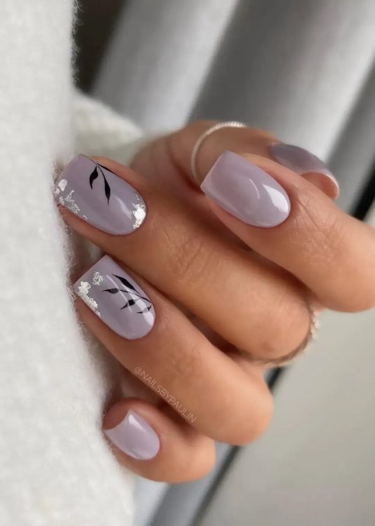 Сірий лак з блискітками чудово поєднується з ніжним лавандовим відтінком, а візерунки, схожі на вихори, роблять дизайн жіночним, витонченим та елегантним.