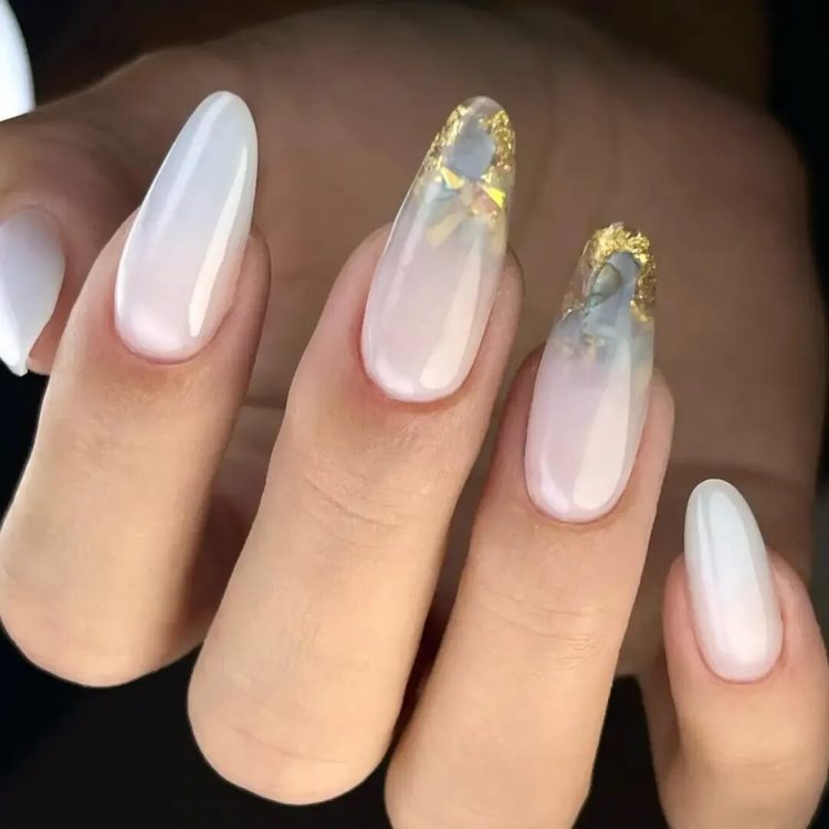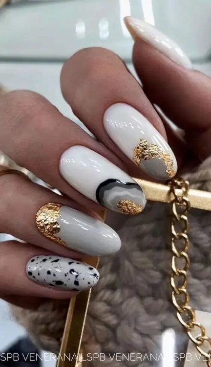 Монохромні мармурові розводи, фрагменти золотої фольги та візерунок “перепелине яйце” роблять біло-сірий дизайн нігтів яскравим та оригінальним.