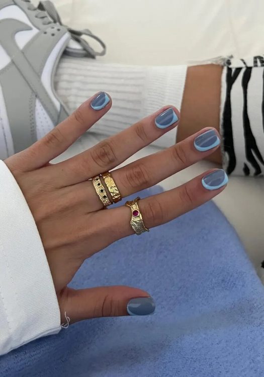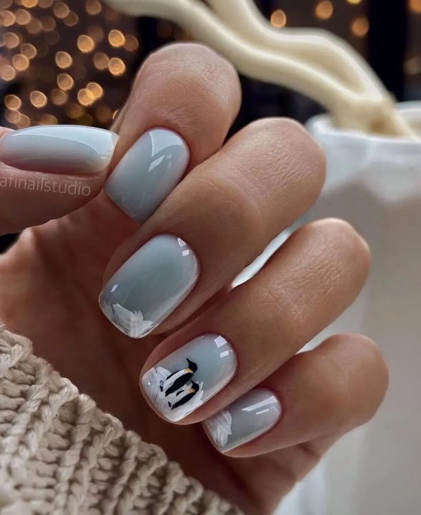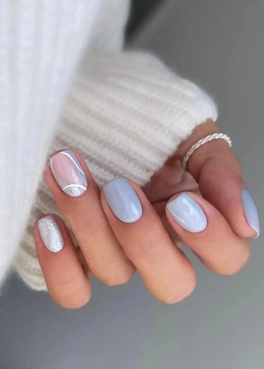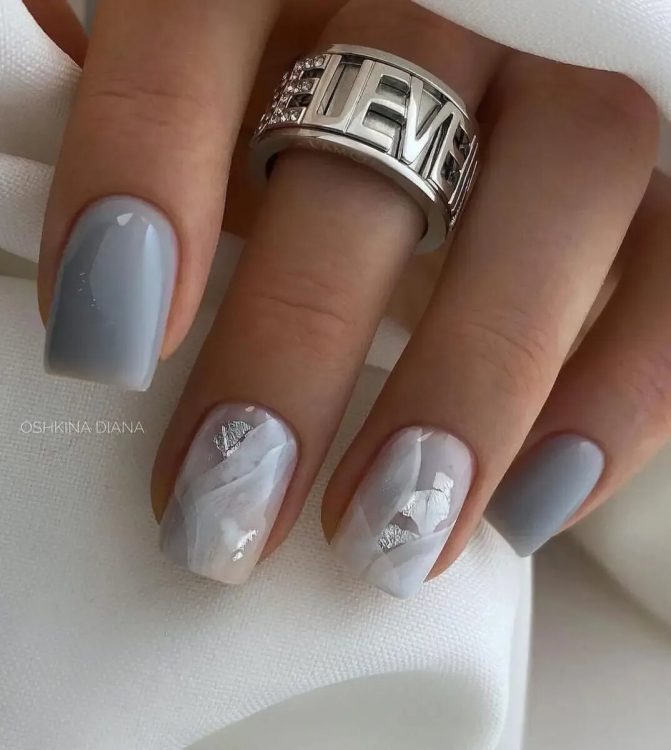 Футуристичний сіро-блакитний манікюр зробить вас неперевершеною. Він ідеально впишеться у повсякденний образ із класичними джинсами.