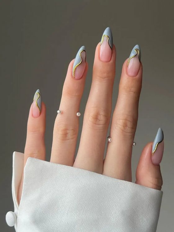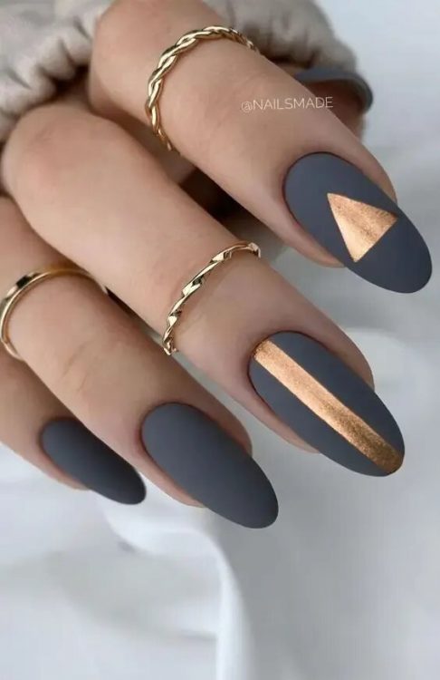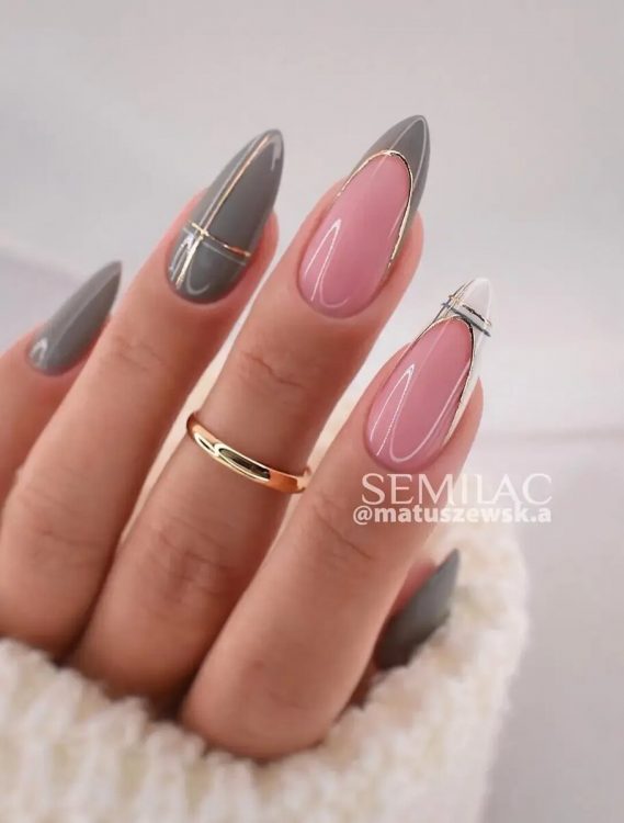 Протилежності притягуються – це правило працює і в нейл-арті. Холодний відтінок сірого чудово поєднується з теплим золотим контуром.