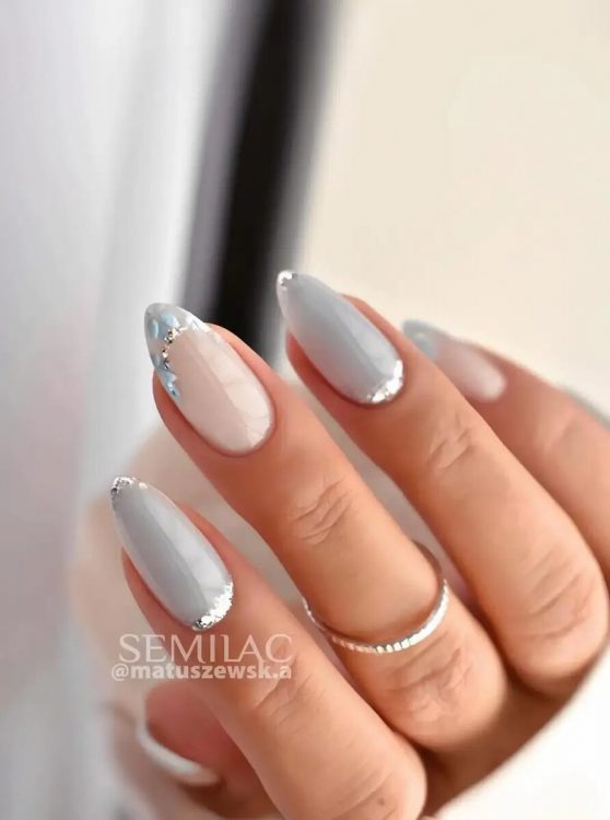 Цей манікюр дозволить кожній відчути себе сніжною королевою. Мініатюрні крижані кінчики та срібний блиск роблять його елегантним та витонченим.