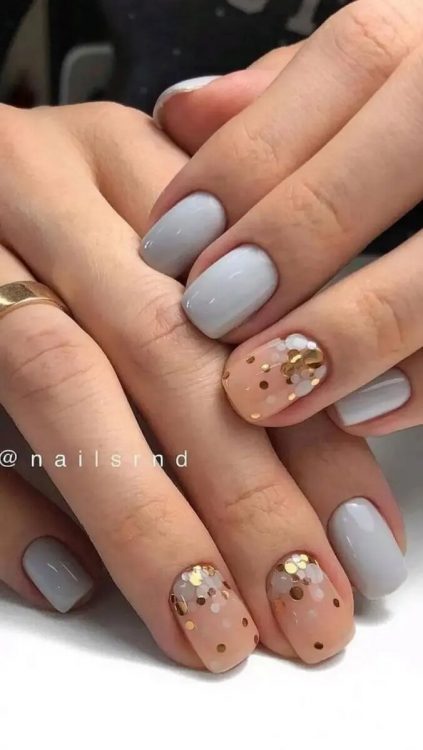Цей приголомшливий сірий манікюр із витонченими золотими акцентами стане чудовим вибором для тих, хто любить носити каблучки та браслети із золота.