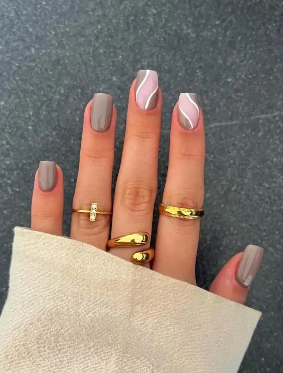 Колір тауп не виходить із трендів. Спробуйте використати цей гарний сіро-коричневий відтінок для створення елегантного манікюру із хвилеподібними візерунками.