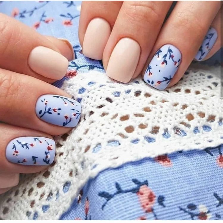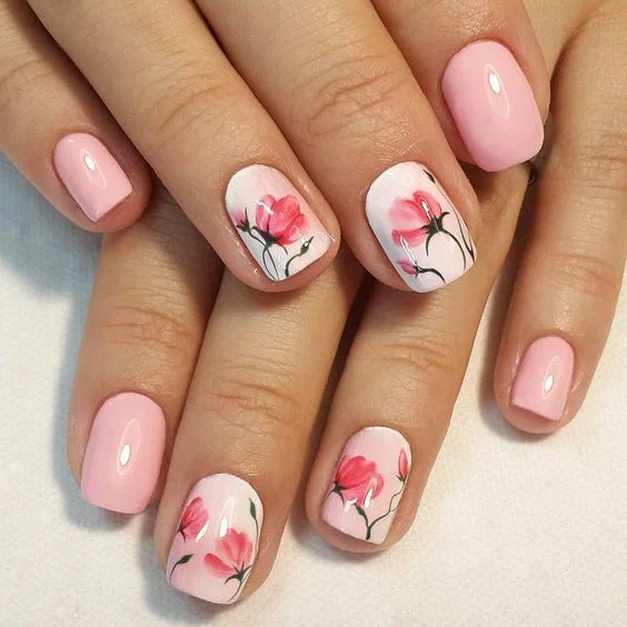 Не втрачає своєї популярності цієї весни і манікюр с квіточками. Виглядає подібний дуже жіночно та елегантно, особливо якщо за основу взяті пастельні тони, а у самого малюнка тонкі та витончені лінії.