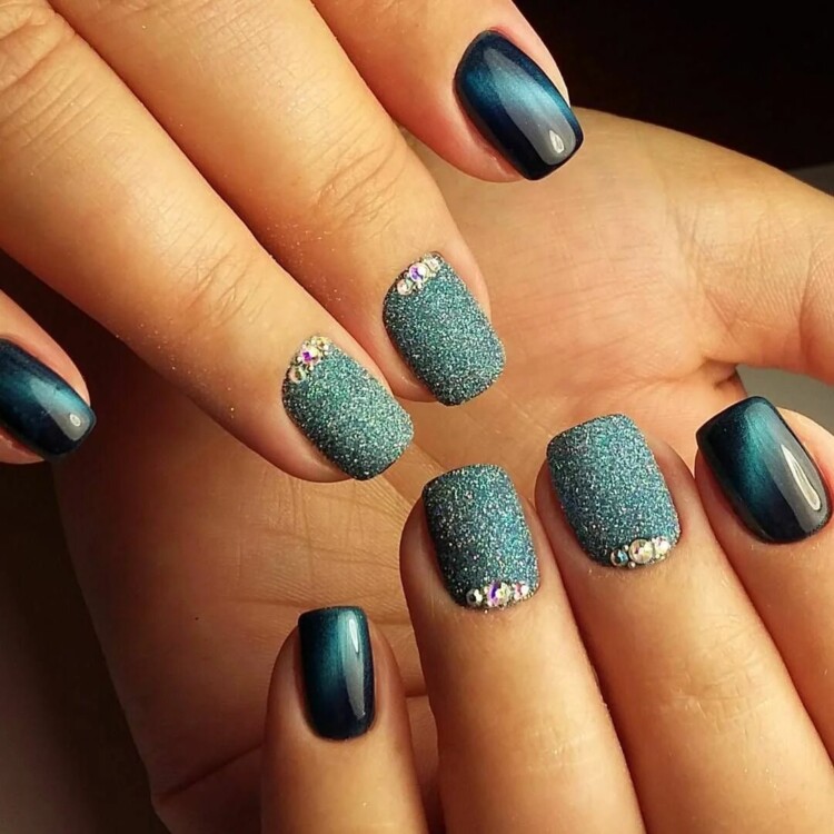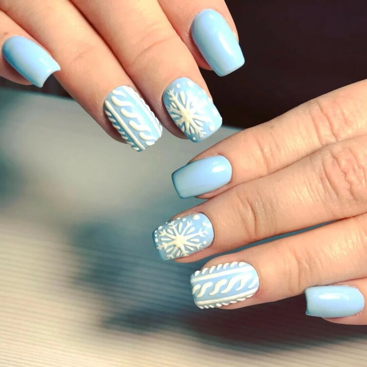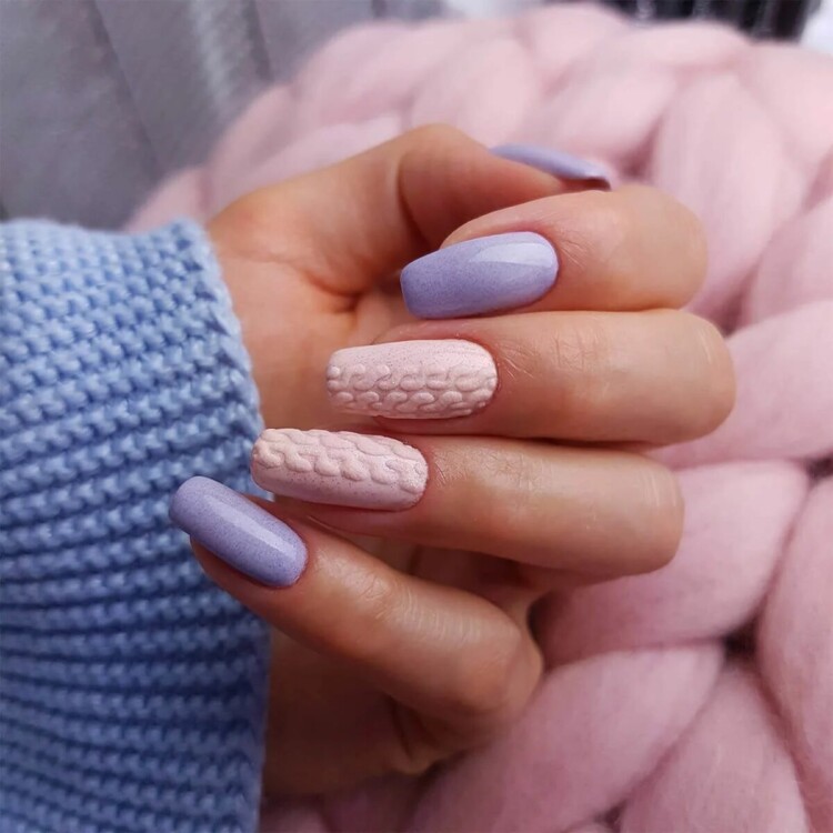 Також можна виконати манікюр із застосуванням гліттеру. Варто виділити пару нігтиків для додавання блискіток. Відтінок можна підібрати індивідуально. Від стриманих до насичених і яскравих кольорів. Для новорічного манікюру ідеально підійде фольга. Колір фольги можна вибрати різнобарвний. В’язаний манікюр вже не перший сезон користується попитом. Будь-який колір тут буде доречним.