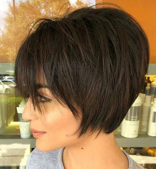 Волосся отримує запаморочливий прикореневий об’єм завдяки гарному переходу від короткого волосся на потилиці до довшого на самій маківці. Перукарі рекомендують прикрашати коротку стрижку боб косими довгими чубчиками, рівними градуйованими моделями, а також асиметричним чубчиком.