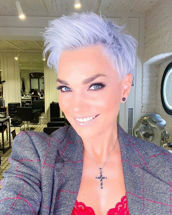 Для створення стильного образу ультракоротка стрижка піксі – саме те, що потрібно. Жінки віком 40+ віддають їй перевагу за можливість виглядати свіжо і молодо без особливих зусиль. Стрижка виглядає зухвало але саме це і додає образу особливої пікантності. Відкрита шия виглядає досить спокусливо, а відсутність чубчика робить очі виразнішими. Така зачіска додасть жінці впевненості в собі і підніме самооцінку.