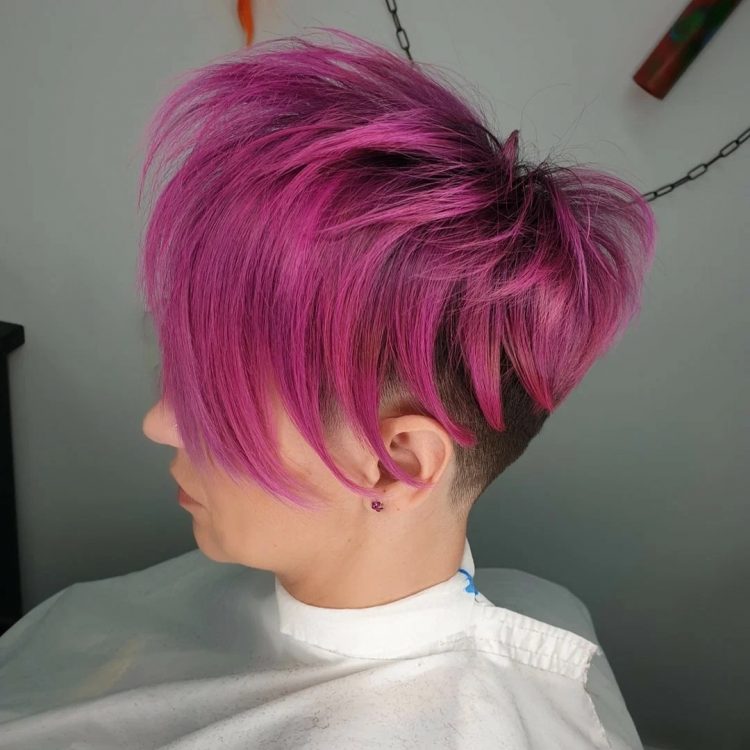 Перед вами виразна стрижка піксі з подовженою та філірованою маківкою, яку колористи розфарбували у яскраво-рожевий колір. Затемнене коріння робить шевелюру більш об’ємною і густою.