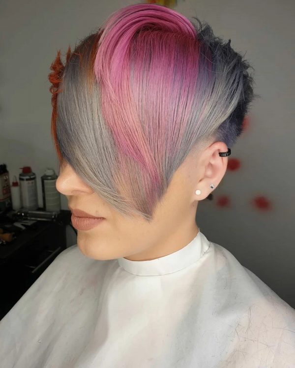 Райдужне фарбування також підійде для короткої піксі. Цей варіант включає срібні, рожеві, сині і руді пасма волосся. Легкий хаос додає цій стрижці завершеності та сучасності.