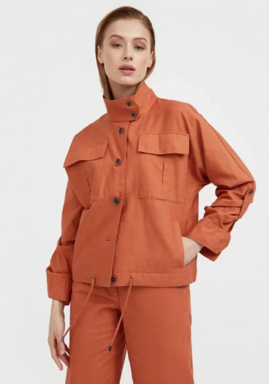 Жакет з бавовни і льону в стилі робочої уніформи ідеально впишеться в повсякденні образи. Його можна носити і з базовими джинсами, і з елегантними брюками, і з легкими жіночними сукнями.