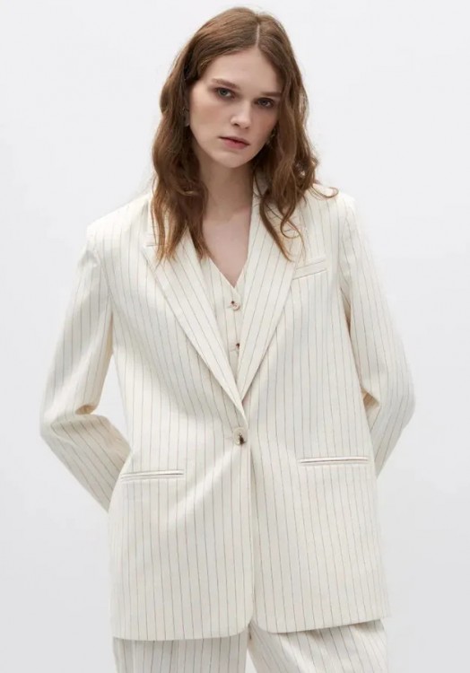 Лаконічний піджак в тонку смужку – вдале доповнення до багатошарових аутфітів.