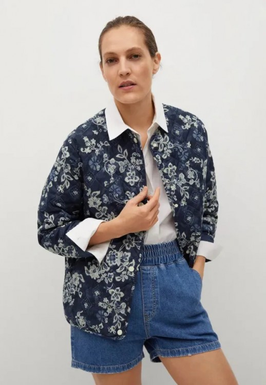 Додати образу фактурності допоможе стьобаний жакет з квітковим принтом. Він ідеально поєднується зі світлими джинсами і шовковою блузкою.