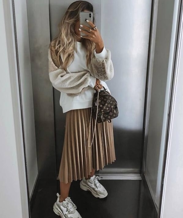 Перед вами головний жіночний тренд цього сезону, а саме, спідниця плісе універсального бежевого кольору. За рахунок свого фасону ця модель виграшно приховає всі вади тіла, підкресливши при цьому лише переваги.