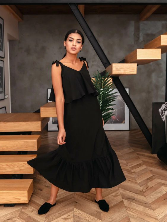 Об’ємна максі сукня з воланами на тонких бретельках – ідеальний формат для літньої спекотної погоди. В 2022 році у тренді будуть однотонні моделі у лаконічному виконанні. Базовий фасон, об’ємні волани на грудях та об’ємна баска внизу виробу — головні критерії ідеальної літньої сукні, яку можна використовувати як на кожен день, так і для особливих випадків.