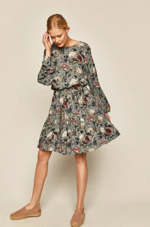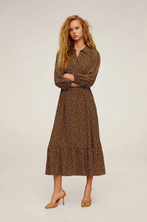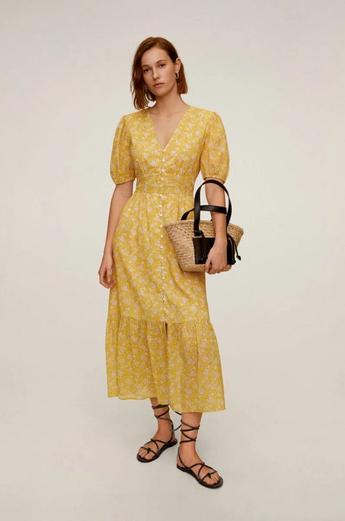 Сукня «селянки» з милим квітковим принтом, шикарними рукавами-ліхтариками та глибоким декольте стане чудовим варіантом на кожен день. Такий фасон ідеально перегукується з ультрамодними сандалями з тонкими перемичками на плоскій підошві, а також об’ємними плетеними сумками.