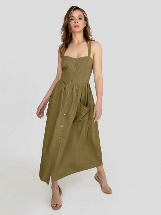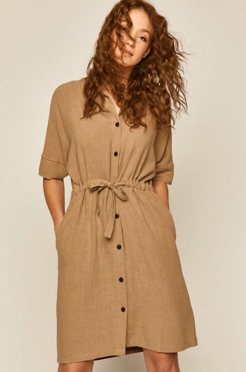 Лляна сукня-халат з акцентом на талії – чергова універсальна база на кожен день. Стилісти рекомендують сучасним модницям обирати сукні нейтрального кольору, їх можна доповнювати яскравими акцентами, отримуючи в результаті ефектний варіант образу.