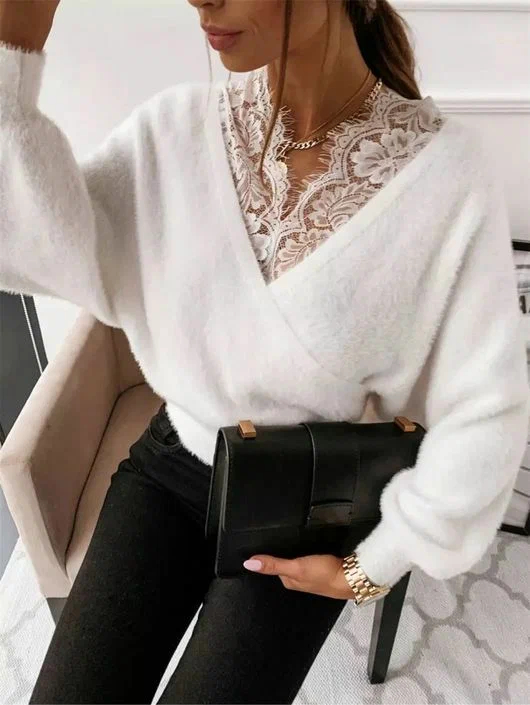Наступна модель светра може стати чудовою деталлю святкового образу, цей виріб виконаний з м’якої білої ангори, прикрашений витонченим та ніжним мереживом в області декольте.