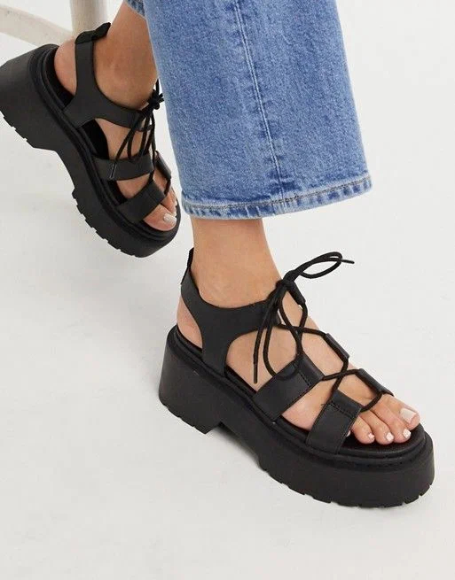 Босоніжки на невисокому масивному підборі, прикрашені тонкими шнурівками – взуття, яке чудово стилізується під різні образи.