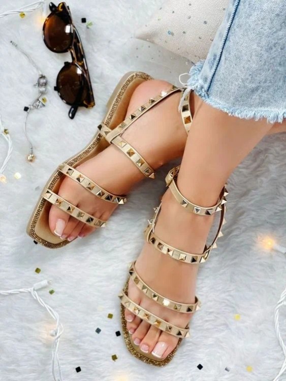 Щодня гуру моди радять вибирати босоніжки на плоскій підошві з безліччю тонких перемичок, прикрашених контрастними шипами.