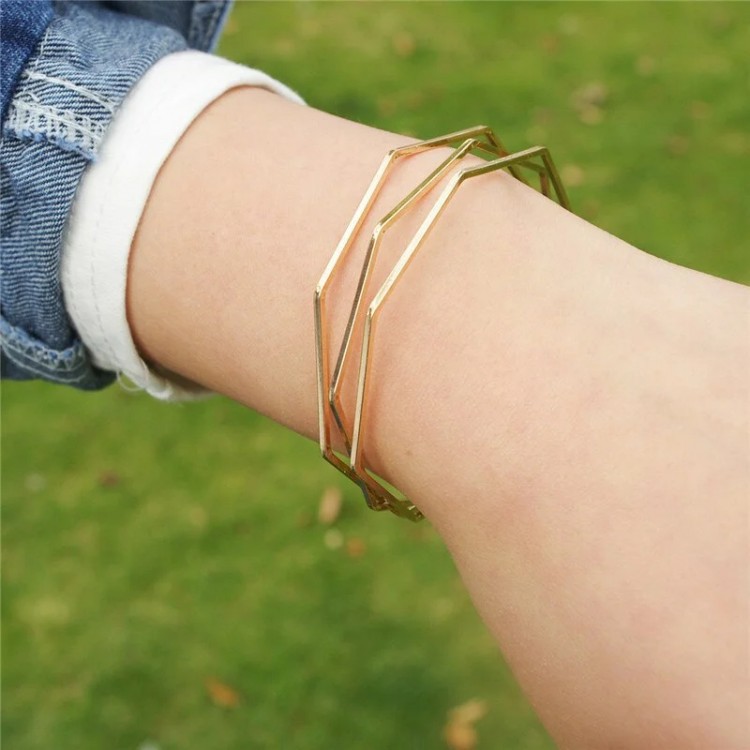 Першими в нашому списку йдуть браслети зі строгими геометричними формами. Це може бути все, що завгодно – ромби, квадрати або прямокутники. Головне, щоб у них були присутні гострі кути і чіткі лінії.