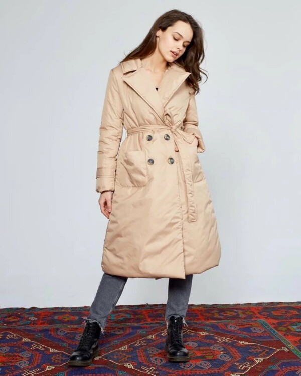 Така ж унікальна річ, як і пуховик-тренч, але менш практичний, так як не має гудзиків, кнопок, блискавки. Носиться тільки на запах, зав’язаний поясом і не відрізняється високою стійкістю до вітру і холоду.